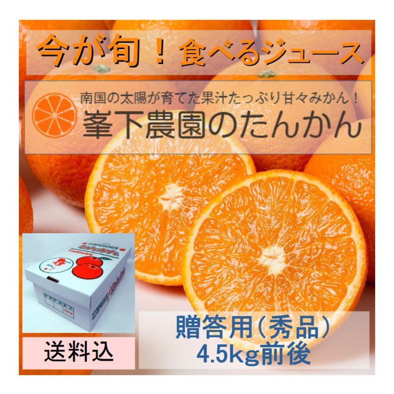果汁たっぷり甘酸っぱいたんかん。峯下農園産のたんかんは食べるジュースといっても過言ではありません。果肉はオレンジ色で柔らかく多汁で酸味が少なく甘みに富み風味が良いとされる九州産高級フルーツ。